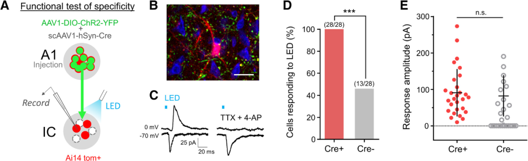 進一步研究了AAV順向跨突觸傳導的突觸特異性的功能特征(見下圖)。將scAAV1-hSyn-Cre和AAV1-EF1a-DIO-ChR2-YFP 1:1混合注射入Ai14 小鼠初級視覺皮層V1,只有共轉這2種病毒的神經元才能表達ChR2,采用全細胞記錄技術,藍光誘發突觸前神經元興奮,產生動作電位,動作電位傳導到突觸后神經元也可以產生神經沖動,發現其功能性連接的下丘神經元IC被標記,且在TTX和4-AP存在的時候沒有變化。證明AAV1更傾向于標記注射點下游突觸連接的神經元。