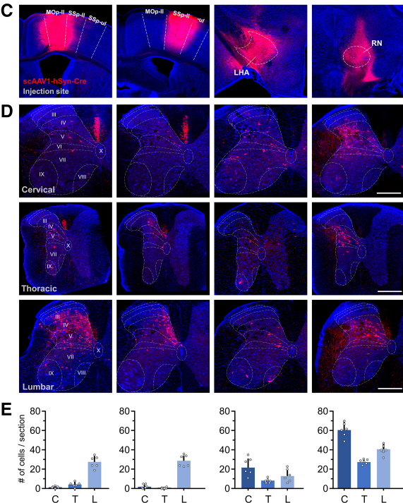 腦-脊髓投射神經環路中的研究結果見下圖。將scAAV1-hSyn-Cre注射入Ai14 小鼠的初級運動皮層Mop-II、初級軀體感覺皮層SSP-II、外側下丘腦LHA、紅核RN中,14天后,發現脊髓頸椎、胸椎和腰椎處神經元被不同程度標記,證明AAV1在腦-脊髓投射神經環路中具有順向跨突觸標記能力,為進一步研究腦-脊髓投射神經環路功能奠定了基礎。