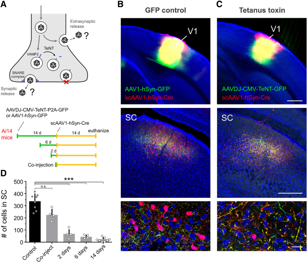 作者探究了AAV1從突觸末端釋放的機理(見下圖)。將AAVDJ-CMV-TeNT-P2A-GFP ( AAV1-hSyn-GFP 作為對照) 注射入Ai14小鼠的初級視覺皮層V1。14天后在同一腦區注射入scAAV1-hSyn-Cre,并在2周后檢測上丘SC中 tdTomato+細胞數目。結果顯示:TeNT組跨突觸標記tdTomato +細胞數目較對照組減少約94%。TeNT可通過切割VAMP2從而完全阻斷Ca2+誘發的突觸囊泡融合和神經遞質的釋放,從而證實了AAV的傳導明顯依賴于突觸囊泡的釋放。
