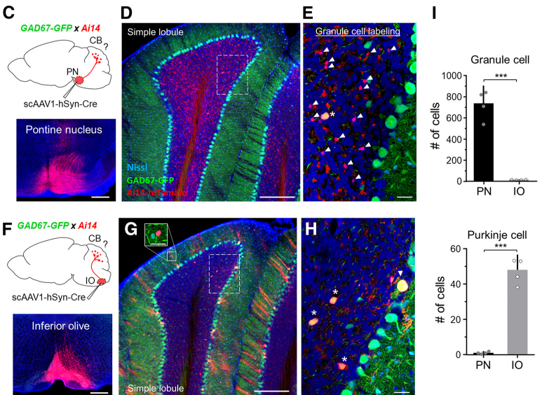 解剖結構的研究結果如下圖:在Ai14 x GAD67-GFP 小鼠的腦橋核PN和下橄欖核IO分別注射scAAV1-hSyn-Cre,發現小鼠的來自PN的投射標記出小腦大量的顆粒細胞GCs,而小鼠的來自IO的投射標記出小腦中的浦肯野細胞PCs,從而證實了AAV順向跨突觸傳導可特異性標記突觸后的細胞群。