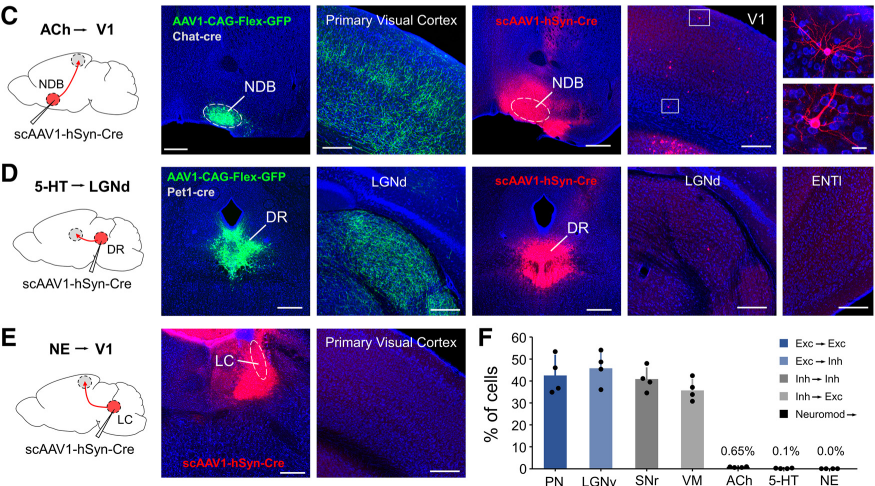神經調質神經環路中的研究結果見下圖。將scAAV1-hSyn-Cre注射入Ai14 小鼠斜帶核NDB、背側中縫核DR和藍斑LC中,14天后,發現其投射的下游腦區神經元被稀疏或者零標記。證明AAV1順向跨突觸標記能力在神經調質能的神經環路中的應用比較局限:在谷氨酸和γ氨基丁酸神經環路中,AAV1具有高效的順向跨突觸標記能力;而乙酰膽堿、五羥色胺和去甲腎上腺素神經環路中則顯得極其遜色。