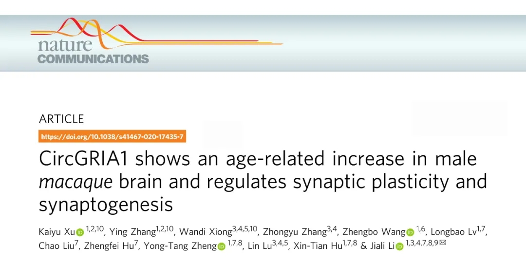 2020年7月,中國科學院昆明動物研究所李家立團隊又在《Nature Communications》(IF=12.121)上發表了題為“CircGRIA1 shows an age-related increase in male macaque brain and regulates synaptic plasticity and synaptogenesis”的研究論文,文章在上述研究工作基礎上發現CircGRIA1的表達在獼猴前額葉皮層和海馬區具有年齡特異性和雄性特異性,并且順式作用于Gria1基因啟動子進而調控Gria1基因的表達;體內外操縱circGRIA1表達能夠負調節Gria1基因的表達,敲低circGRIA1可顯著改善老年雄性獼猴海馬神經元的突觸可塑性及突觸再生。該論文強調了CircRNA調控的重要性,加深了人類對腦衰老生物學的了解。