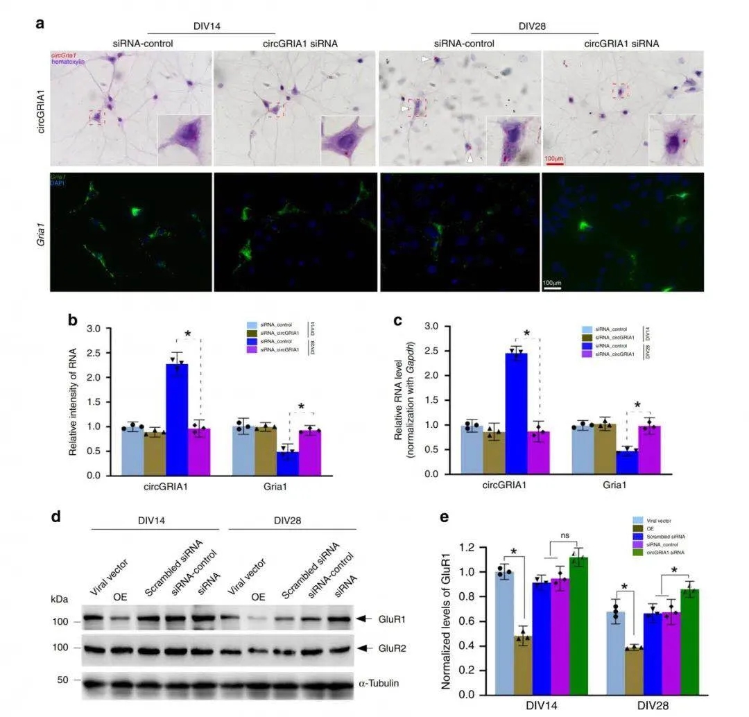 作者使用慢病毒載體(MOI=5-10)感染DIV5的胎猴海馬神經元,體外操縱CircGRIA1,通過BASEscope ISH和RNAscope ISH技術檢測CircGRIA1和其宿主(Gria1)mRNA的表達,發現DIV28,siRNA感染組的CircGRIA1表達顯著降低;而其宿主(Gria1)mRNA的表達水平則升高。(圖4)