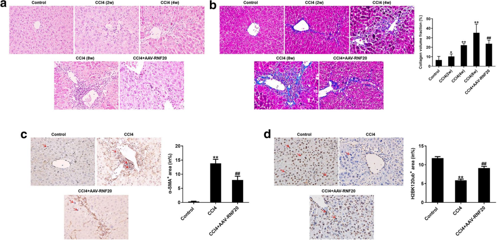 為探究RNF20在肝纖維化中的作用,研究人員建立了活體肝纖維化模型,如圖3所示,使用AAV8過表達RNF20顯著逆轉了小鼠肝組織中由CCl4引起的炎性浸潤和膠原體積,同時逆轉CCl4導致的α-SMA的表達增加和H2BK120ub蛋白水平的降低,這些結果表明,RNF20過表達可(ke)明顯減輕體內肝(gan)纖維化癥狀(zhuang)。
