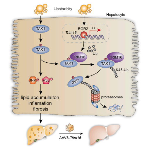 在本研究中,為了確定減輕脂毒性有害后果的關鍵分子,作者進行了綜合多組學分析,確定了E3連接酶TRIM16為候選分子,進一步分析發現TRIM16在脂毒性反應中顯著上調,并且過表達TRIM16(AAV8腹腔注射)減輕了(le)NASH小鼠模型的(de)(de)脂質積累和(he)肝損傷。同時(shi),作者(zhe)還闡(chan)明了(le)TRIM16調控NASH的(de)(de)機制(zhi),即TRIM16通(tong)過(guo)優先(xian)與磷(lin)酸化(hua)的(de)(de)TGF-β活化(hua)激(ji)(ji)酶 1 (TAK1) 相互作用(yong)并通(tong)過(guo)催(cui)化(hua)K48連(lian)接的(de)(de)泛素化(hua)促進(jin)其降解,來減弱絲裂(lie)原(yuan)活化(hua)蛋白激(ji)(ji)酶 (MAPK)信號通(tong)路的(de)(de)激(ji)(ji)活,進(jin)而(er)抑制(zhi)NASH的(de)(de)發展。總的(de)(de)來說,該研究表明TRIM16是一種(zhong)特定的(de)(de)TAK1調節器,可以在NASH中作為潛在的(de)(de)治療靶(ba)標。
