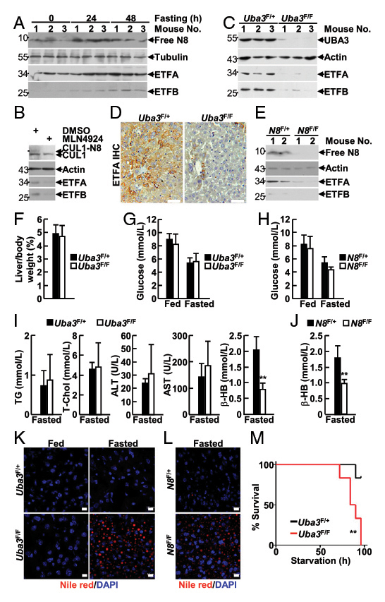 在本研究中,作者構建的肝臟特異性UBA3和NEDD8缺失的小鼠模型,表現出自發性脂肪肝和肝細胞衰老的新生兒死亡,并伴有肝臟脂肪酸-β氧化缺陷;成年小鼠中UBA3的特異性缺失(通過AAV-DJ進行尾靜脈注射)導(dao)(dao)致ETF蛋(dan)白(bai)的(de)減少,并(bing)增加(jia)禁食誘導(dao)(dao)的(de)脂肪變(bian)性和死(si)亡(wang)率(lv)。IB和IF分析發(fa)(fa)現新(xin)生(sheng)小鼠線粒體蛋(dan)白(bai)也發(fa)(fa)生(sheng)類泛(fan)(fan)素化(hua),免(mian)疫共沉(chen)淀分析發(fa)(fa)現ETF蛋(dan)白(bai)為類泛(fan)(fan)素化(hua)的(de)底物。此外(wai),ETF基因突變(bian)導(dao)(dao)致類泛(fan)(fan)素化(hua)修飾(shi)缺陷,促進(jin)了(le)GA-II的(de)發(fa)(fa)病。本研究表明類泛(fan)(fan)素化(hua)修飾(shi)是一種(zhong)可(ke)以通過阻斷肝(gan)細胞內ETFs的(de)泛(fan)(fan)素化(hua)和降解來靶向并(bing)穩定ETFs的(de)泛(fan)(fan)素化(hua)樣(yang)修飾(shi)途徑,肝(gan)類泛(fan)(fan)素化(hua)可(ke)防止新(xin)生(sheng)小鼠出現GA-II類異(yi)常,降低成年小鼠因禁食引起的(de)死(si)亡(wang)率(lv)。