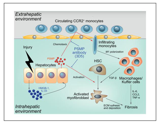 首先,研究者通過免疫組織化學檢測了不同肝臟疾病組織中的PSMP水平,發現PSMP在肝纖維化患者肝組織中表達較高。接著,構建了PSMP敲除小鼠(PSMP-/-小鼠),發現PSMP-/-小鼠血清丙氨酸轉氨酶(ALT)水平明顯降低,肝損傷得到改善。利用AAV8載體在PSMP-/-小鼠過表達hPSMP,發現肝損傷和纖維化顯著加重;并通過構建PSMP和CCR2雙敲除小鼠模型發現PSMP過表達以CCR2依賴的方式促進肝纖維化的發展。作者揭示了PSMP通過促進炎癥巨噬細胞浸潤、M1極化、促炎細胞因子產生以及通過CCR2直接激活肝星狀細胞進而加速肝纖維化,提出PSMP可能是一個潛在的肝纖維化治療靶點,其抗體可能是治療肝纖維化的潛在藥物。