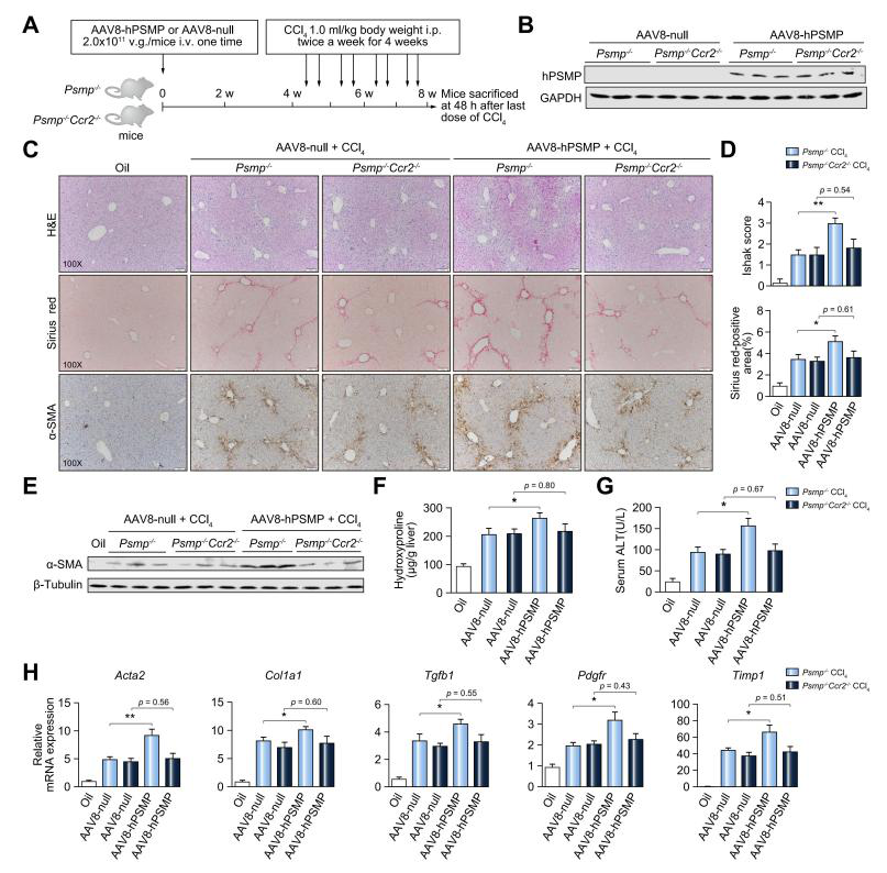 通過尾靜脈注射AAV8-hPSMP后,PSMP-/-小鼠肝臟PSMP表達量顯著升高,注射4周后PSMP依舊有較高的表達。接著再用CCl4處理以誘(you)導肝(gan)(gan)纖維(wei)化,發(fa)(fa)現(xian)PSMP過表(biao)達引起的肝(gan)(gan)損傷和(he)纖維(wei)化顯著加重,并通過構建PSMP和(he)CCR2雙(shuang)敲(qiao)除小鼠模型發(fa)(fa)現(xian)PSMP過表(biao)達以CCR2依賴的方式促(cu)進肝(gan)(gan)纖維(wei)化的發(fa)(fa)展。