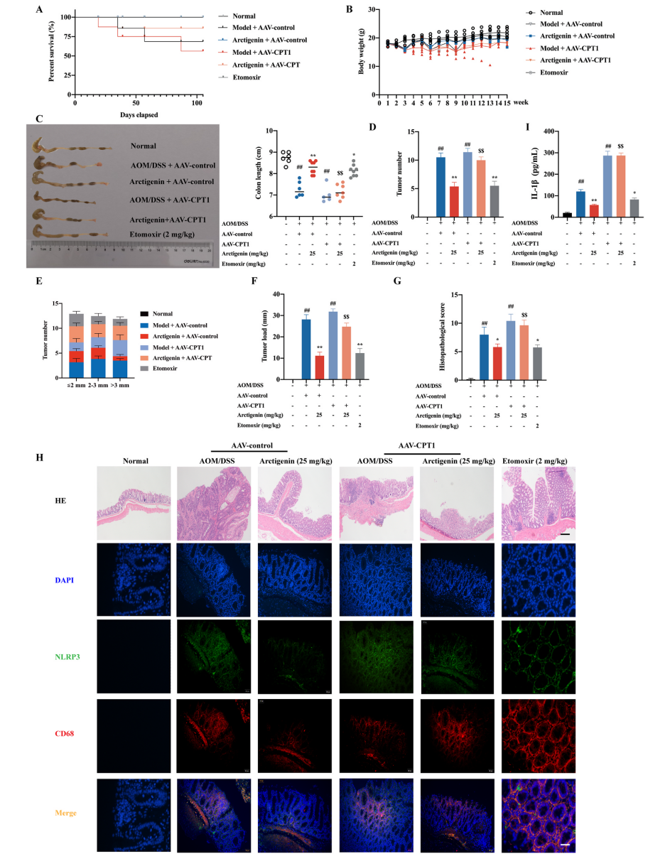 為了確定牛蒡子苷(gan)元(yuan)的(de)抗CAC作(zuo)用(yong)(yong)是否與CPT1介(jie)導的(de)FAQ下(xia)調有(you)關,研究人員使(shi)用(yong)(yong)AAV9作(zuo)為載體(ti),在CAC小(xiao)鼠(shu)結(jie)(jie)(jie)腸(chang)組(zu)織中(zhong)特異性過表(biao)達(da)(da)CPT1。結(jie)(jie)(jie)果發現CPT1過表(biao)達(da)(da)的(de)小(xiao)鼠(shu)在存活率、體(ti)重、結(jie)(jie)(jie)腸(chang)長度等方(fang)面都有(you)顯(xian)著降低(di),且結(jie)(jie)(jie)腸(chang)組(zu)織腫瘤數量、負(fu)載量和大小(xiao)均顯(xian)著增加。組(zu)織病理學檢查(cha)顯(xian)示CAC小(xiao)鼠(shu)和CAC伴CPT1高表(biao)達(da)(da)組(zu)小(xiao)鼠(shu)結(jie)(jie)(jie)腸(chang)粘膜內有(you)大型(xing)腺癌(ai)。此外,上述兩組(zu)的(de)小(xiao)鼠(shu)表(biao)現出炎(yan)癥反應和隱窩減少(shao)癥狀(zhuang),且CD68+ NLRP3+巨(ju)(ju)噬(shi)細(xi)胞數量顯(xian)著增加。CPT1過表(biao)達(da)(da)顯(xian)著增加了IL-1β的(de)表(biao)達(da)(da),同時(shi)也促進了結(jie)(jie)(jie)腸(chang)組(zu)織中(zhong)α-微管蛋白(bai)乙酰化和乙酰輔(fu)酶(mei)A的(de)產生。牛蒡子苷(gan)元(yuan)對結(jie)(jie)(jie)腸(chang)巨(ju)(ju)噬(shi)細(xi)胞和CAC中(zhong)NLRP3炎(yan)癥體(ti)激活的(de)抑制作(zuo)用(yong)(yong)隨著結(jie)(jie)(jie)腸(chang)組(zu)織中(zhong)CPT1的(de)過表(biao)達(da)(da)而逐漸消(xiao)失,以上結(jie)(jie)(jie)果闡(chan)明了牛蒡子苷(gan)元(yuan)主要通過下(xia)調結(jie)(jie)(jie)腸(chang)巨(ju)(ju)噬(shi)細(xi)胞中(zhong)CPT1的(de)表(biao)達(da)(da)和NLRP3炎(yan)性小(xiao)體(ti)的(de)激活來(lai)抑制CAC,同時(shi)也揭示了CPT1在炎(yan)癥小(xiao)體(ti)激活和結(jie)(jie)(jie)腸(chang)癌(ai)發生進展中(zhong)的(de)作(zuo)用(yong)(yong)。