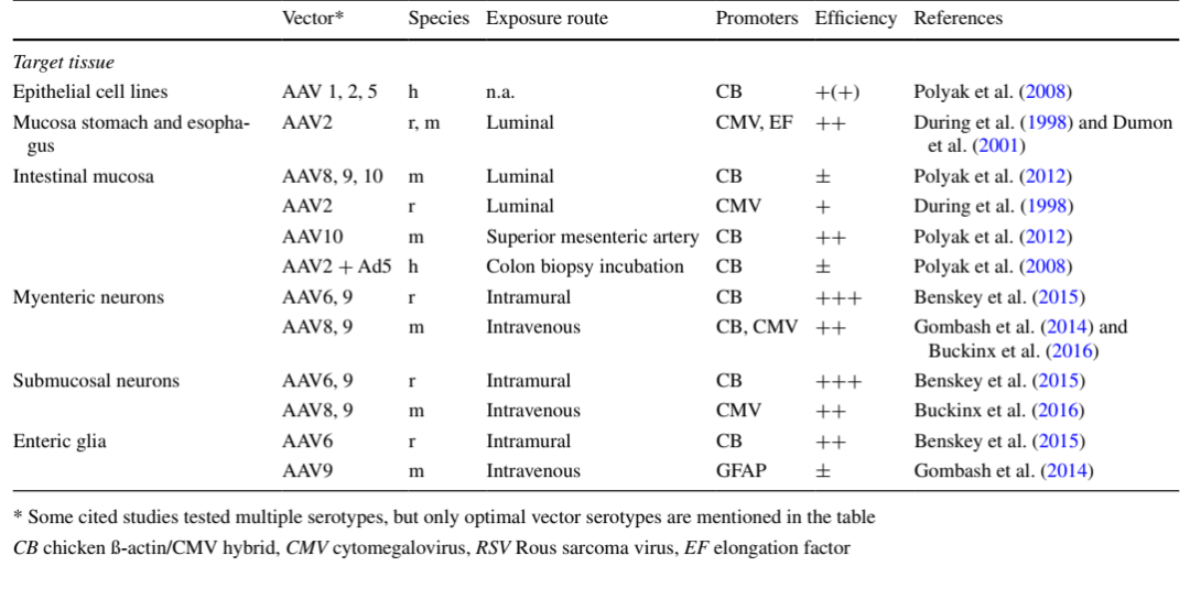 下表為AAV靶(ba)向腸道不同部位較(jiao)優(you)血清型和(he)啟動子的總(zong)結(jie):
