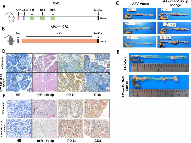 研究人員利用腺相關(guan)病毒(AAV-miR-15b-5p sponge)載體感染(ran)CAC和APCMin/+小(xiao)鼠結腸組(zu)織(zhi),抑(yi)制(zhi)miR-15b-5p的(de)(de)(de)表(biao)達(da)。作者觀察發現在(zai)CAC和APCMin/+結腸癌小(xiao)鼠模型中(zhong),miR-15b-5p表(biao)達(da)的(de)(de)(de)阻斷明顯(xian)促進(jin)了腫瘤的(de)(de)(de)發生(sheng),提高了PD-L1表(biao)達(da),同時顯(xian)著(zhu)減(jian)少了CD8+細胞數量,說(shuo)明miR-15b-5p通過(guo)靶向PD-L1抑(yi)制(zhi)腫瘤的(de)(de)(de)發生(sheng)。