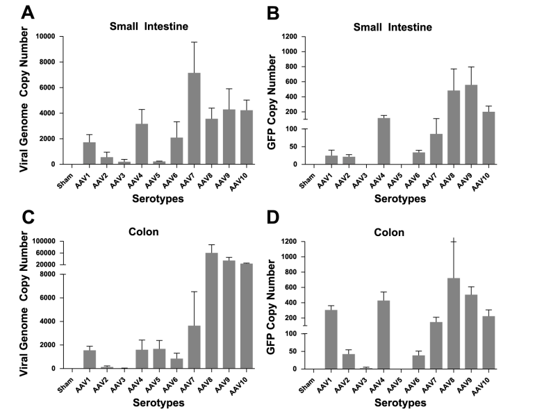 AAV2、AAV7、AAV8、AAV9和AAVrh10對腸(chang)(chang)道組織的轉導效(xiao)率較高,其中(zhong)AAV7對小(xiao)腸(chang)(chang)的感染效(xiao)率相(xiang)對較高,AAVrh10已被(bei)證(zheng)明(ming)能夠(gou)在腸(chang)(chang)道中(zhong)長效(xiao)表達外源基因,尤其是在結腸(chang)(chang)中(zhong),目前研究(jiu)中(zhong)應用較多的血清(qing)型(xing)是AAV9。腸(chang)(chang)道研究(jiu)中(zhong),啟動子通(tong)常選擇廣譜型(xing)啟動子CMV。