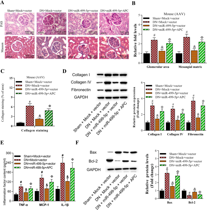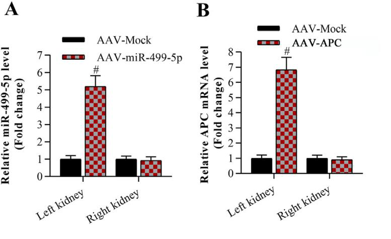 為探究金絲桃苷的具體調控機制,研究人員將AAV9-miR-499-5p及AAV9-APC通過腎靜脈注射至小鼠左腎組織中,RT-qPCR檢測證實miR-499-5p及APC在小鼠左腎組織中成功過表達(圖(tu)6)。數據(ju)表明miR-499-5p和APC的(de)(de)過表達對糖尿病(bing)腎(shen)病(bing)小鼠(shu)的(de)(de)血糖、體重及(ji)血壓等指(zhi)標均無影響。此外,miR-499-5p對糖尿病(bing)腎(shen)病(bing)小鼠(shu)病(bing)癥的(de)(de)抑制作用(yong)可被APC的(de)(de)過表達抵消(圖(tu)7)。