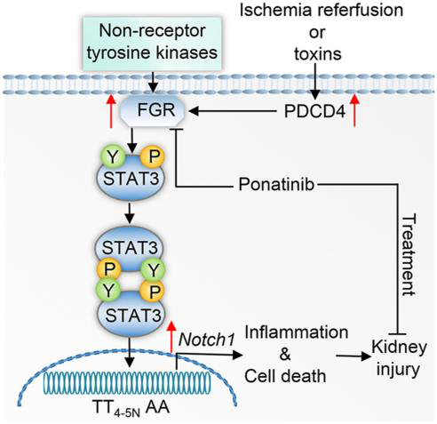 在本(ben)研究中(zhong),作者采用(yong)腎(shen)(shen)缺血再(zai)灌注損傷(IRI)和(he)順鉑(bo)誘(you)導的(de)(de)(de)AKI小鼠模型(xing),發(fa)現PDCD4在AKI小鼠中(zhong)表達(da)豐富,其缺失(shi)可顯著改(gai)善(shan)AKI小鼠的(de)(de)(de)腎(shen)(shen)功能障礙和(he)炎癥反應,不僅(jin)如此,急(ji)性腎(shen)(shen)小管壞死患(huan)者的(de)(de)(de)腎(shen)(shen)臟活檢中(zhong)也發(fa)現PDCD4表達(da)上調。進(jin)一步(bu)研究發(fa)現,酪氨(an)酸(suan)激酶(mei)家(jia)族(zu)成員Fgr的(de)(de)(de)過(guo)表達(da)可顯著加重AKI小鼠模型(xing)的(de)(de)(de)病(bing)癥,并消除了(le)PDCD4缺失(shi)對腎(shen)(shen)臟的(de)(de)(de)保(bao)護(hu)作用(yong)。機制上,PDCD4通(tong)過(guo)磷酸(suan)化STAT3正向調控FGR/ NOTCH1介(jie)導的(de)(de)(de)細胞(bao)凋亡(wang)和(he)炎癥通(tong)路進(jin)而加重AKI。全身給藥(yao)帕納替尼(ponatinib,一種酪氨(an)酸(suan)激酶(mei)抑制劑)可阻斷該通(tong)路改(gai)善(shan)小鼠腎(shen)(shen)損傷。本(ben)研究揭示(shi)了(le)PDCD4在AKI中(zhong)的(de)(de)(de)作用(yong)和(he)分子機制,提示(shi)在多(duo)個水平上靶向PDCD4信號通(tong)路可能是(shi)治療AKI的(de)(de)(de)有效策略,為開發(fa)改(gai)善(shan)AKI的(de)(de)(de)療法提供(gong)了(le)新見解。
