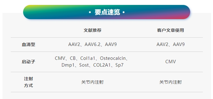 溫馨提示:以上來(lai)自于文(wen)(wen)獻(xian)(xian)報道,AAV在骨骼系統中的轉導(dao)效(xiao)率應結合(he)血清型、啟動(dong)子(zi)及注射方(fang)式等多方(fang)面綜合(he)考慮,建議在進行實驗(yan)前(qian)根據具體想要感染的組織細胞查閱相關(guan)文(wen)(wen)獻(xian)(xian)并進行預實驗(yan)的摸索(suo)。