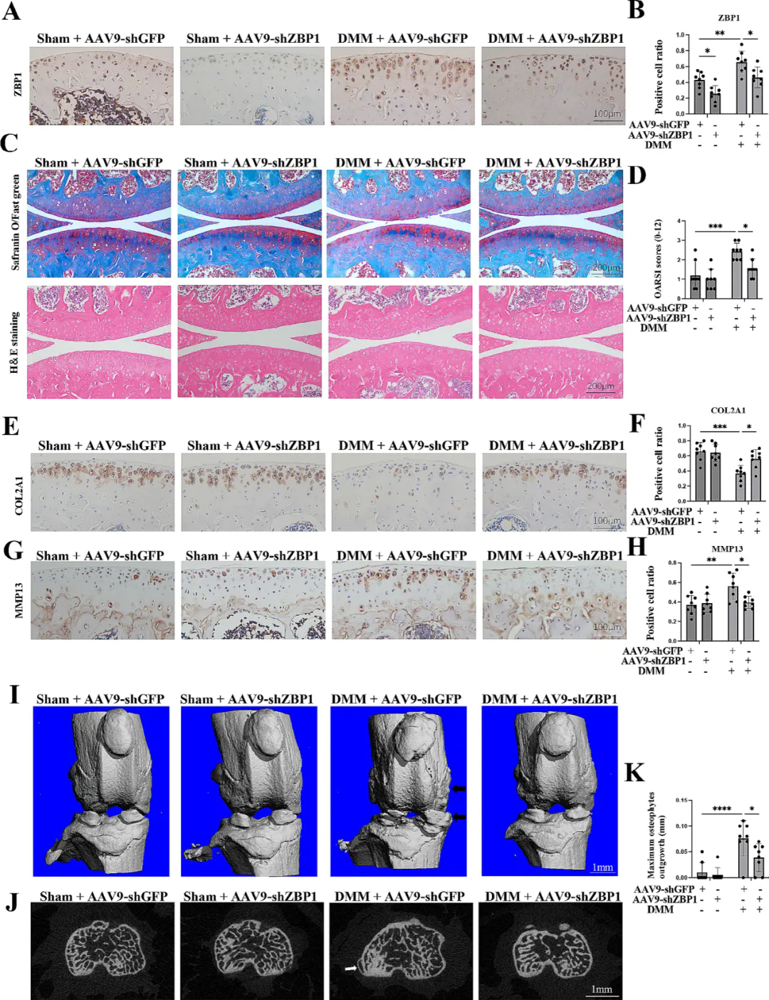 為評(ping)估(gu)軟(ruan)骨(gu)(gu)(gu)細胞(bao)中ZBP1的(de)(de)(de)缺失是否能保護(hu)小(xiao)(xiao)鼠(shu)(shu)免受(shou)OA侵害(hai),研(yan)究團隊將(jiang)AAV9-shZBP1注(zhu)射(she)到小(xiao)(xiao)鼠(shu)(shu)膝關節腔(qiang)內,IHC結果證實(shi),與AAV9-shGFP組(zu)相(xiang)比,AAV9-shZBP1有效減少(shao)(shao)了ZBP1-軟(ruan)骨(gu)(gu)(gu)細胞(bao)數量。在首次注(zhu)射(she)AAV9兩周(zhou)后,進行DMM手術或假手術,并在術后第56天(tian)處死小(xiao)(xiao)鼠(shu)(shu)。與DMM組(zu)相(xiang)比,AAV9-shZBP1組(zu)小(xiao)(xiao)鼠(shu)(shu)關節軟(ruan)骨(gu)(gu)(gu)退(tui)化(hua)較(jiao)少(shao)(shao),OARSI評(ping)分較(jiao)低。通過評(ping)估(gu)四組(zu)軟(ruan)骨(gu)(gu)(gu)下(xia)骨(gu)(gu)(gu)和(he)骨(gu)(gu)(gu)贅(zhui)的(de)(de)(de)變化(hua),發現接受(shou)DMM手術的(de)(de)(de)AAV9-shZBP1注(zhu)射(she)小(xiao)(xiao)鼠(shu)(shu)骨(gu)(gu)(gu)贅(zhui)形成減少(shao)(shao),骨(gu)(gu)(gu)贅(zhui)評(ping)分降低。上(shang)述結果表(biao)明,軟(ruan)骨(gu)(gu)(gu)中ZBP1的(de)(de)(de)下(xia)調保護(hu)了小(xiao)(xiao)鼠(shu)(shu)免受(shou)DMM誘(you)導的(de)(de)(de)軟(ruan)骨(gu)(gu)(gu)退(tui)化(hua)和(he)骨(gu)(gu)(gu)贅(zhui)形成的(de)(de)(de)影響。