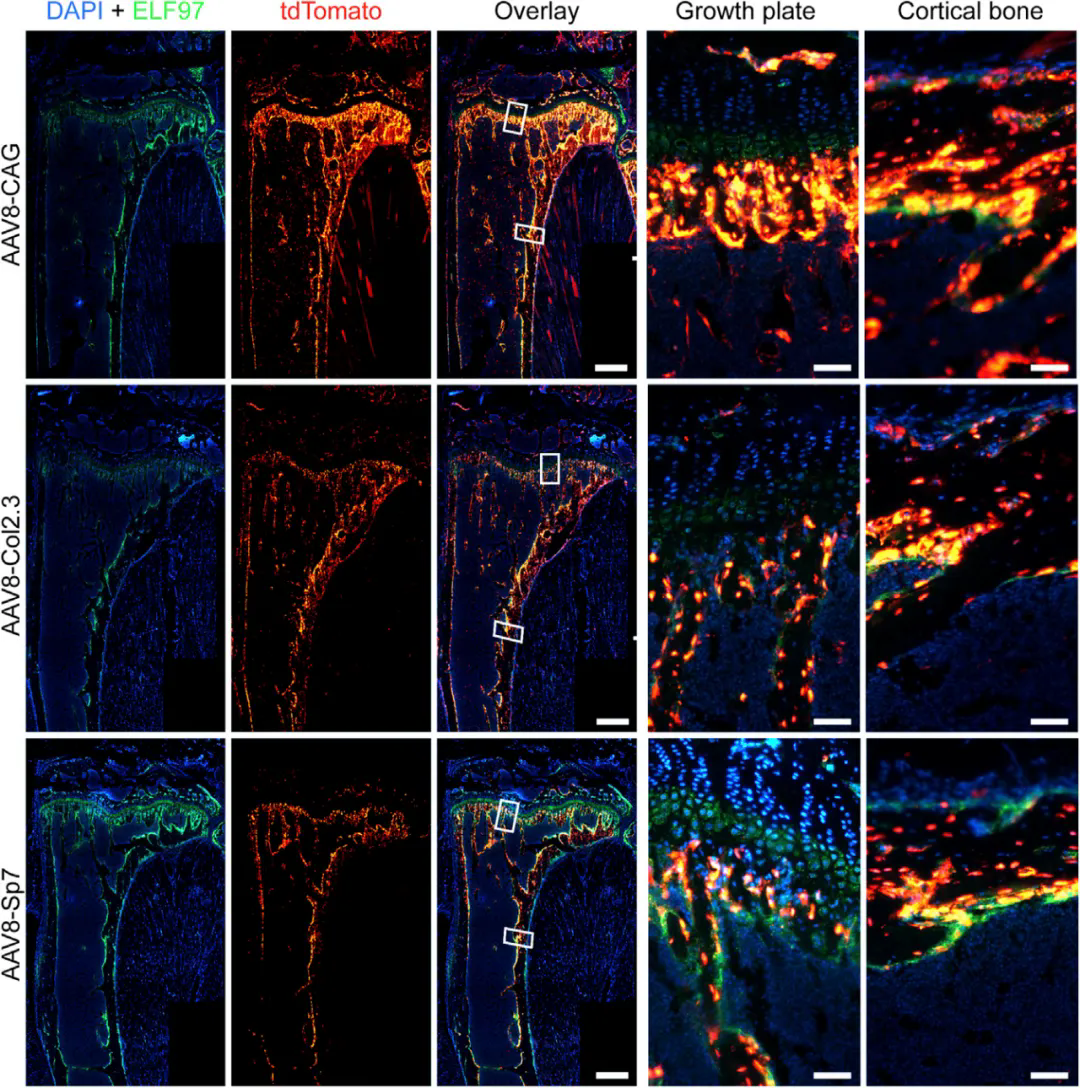 在CAG、Col2.3和(he)Sp7三種(zhong)啟動子的(de)驅(qu)動下,將AAV8-tdTomato(5×1011vg)經尾靜脈注射至(zhi)小鼠體(ti)內,檢測發現三種(zhong)構建體(ti)均成功轉(zhuan)導(dao)(dao)脛(jing)骨細胞(bao)(bao);值得注意(yi)的(de)是(shi),骨特異性啟動子Col2.3和(he)Sp7驅(qu)動的(de)tdTomato表(biao)達與成骨細胞(bao)(bao)標(biao)記物AP共定(ding)位且(qie)轉(zhuan)導(dao)(dao)水平(ping)相(xiang)似。其中Col2.3介導(dao)(dao)骨膜和(he)成骨細胞(bao)(bao)的(de)轉(zhuan)導(dao)(dao),而Sp7主要介導(dao)(dao)成骨細胞(bao)(bao)的(de)轉(zhuan)導(dao)(dao)。