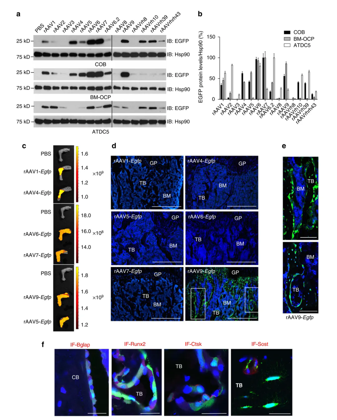 研究團隊評估了在(zai)體(ti)外不同AAV血(xue)清型對小鼠(shu)顱骨(gu)(gu)成(cheng)骨(gu)(gu)細(xi)胞(bao)(COB)、骨(gu)(gu)髓衍生的(de)(de)破骨(gu)(gu)細(xi)胞(bao)前體(ti)(BM-OCP)和(he)軟骨(gu)(gu)細(xi)胞(bao)祖細(xi)胞(bao)(ATDC5)的(de)(de)轉(zhuan)導(dao)效率(lv),發現(xian)rAAV1,rAAV4,rAAV5,rAAV6,rAAV7,rAAV9,rAAVrh.10和(he)rAAVrh.39這八(ba)種AAV載體(ti)能(neng)(neng)夠高效轉(zhuan)導(dao)COB。其中,rAAV1,rAAV4,rAAV5,rAAV6,rAAV7和(he)rAAV9也能(neng)(neng)轉(zhuan)導(dao)BM-OCP,而(er)rAAV1,rAAV6,rAAVrh.10和(he)rAAVrh.39則能(neng)(neng)轉(zhuan)導(dao)ATDC5;此外,rAAV2和(he)rAAV6.2實現(xian)了ATDC5細(xi)胞(bao)的(de)(de)有(you)效轉(zhuan)導(dao),但在(zai)COB中轉(zhuan)導(dao)效果較差。接著(zhu),將體(ti)外篩選(xuan)出的(de)(de)八(ba)種血(xue)清型AAV通過(guo)關(guan)節腔注射到2月(yue)齡小鼠(shu)體(ti)內,發現(xian)僅AAV9能(neng)(neng)夠有(you)效轉(zhuan)導(dao)成(cheng)骨(gu)(gu)細(xi)胞(bao)、破骨(gu)(gu)細(xi)胞(bao)和(he)骨(gu)(gu)細(xi)胞(bao)等。