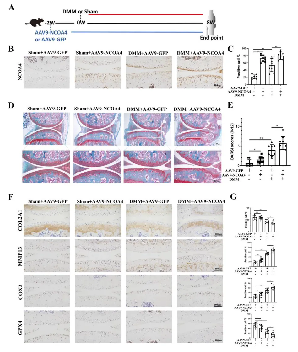 研究團(tuan)隊將AAV9-NCOA4注射到小鼠關(guan)節腔(qiang)中,實現(xian)NCOA4在軟(ruan)骨中的(de)(de)過表達。兩周后,對小鼠進行(xing)DMM手(shou)術或(huo)假(jia)手(shou)術。DMM手(shou)術小鼠發生(sheng)了軟(ruan)骨退(tui)變(bian),表現(xian)為蛋白聚糖損(sun)失和軟(ruan)骨糜爛。值得注意的(de)(de)是,與DMM組相比,AAV9-NCOA4注射小鼠更(geng)(geng)容(rong)易發生(sheng)DMM引(yin)起的(de)(de)退(tui)變(bian),其特點是OARSI評分更(geng)(geng)高。DMM手(shou)術后AAV9-NCOA4處理的(de)(de)小鼠出現(xian)了更(geng)(geng)大的(de)(de)骨贅(zhui),骨贅(zhui)評分更(geng)(geng)高。以上結果表明,NCOA4在軟(ruan)骨中的(de)(de)過表達加速了創傷后骨關(guan)節炎小鼠的(de)(de)軟(ruan)骨退(tui)變(bian)和骨贅(zhui)的(de)(de)形成。