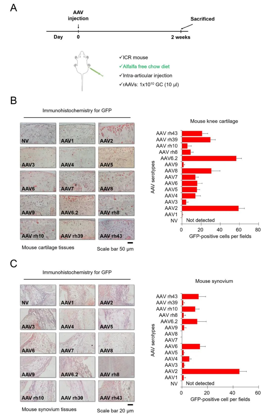 通過膝關節注射不同(tong)AAV血清(qing)型(xing)(AAV1, 2, 3, 4, 5, 6, 7, 8, 9, 6.2, rh8, rh10, rh39, rh43)至不同(tong)樣本軟骨(gu)組織中,發(fa)現與其他AAV血清(qing)型(xing)相比,AAV2和(he)AAV6.2在體內(nei)外軟骨(gu)細胞的基因遞送中均表現出很高的轉導效(xiao)率。