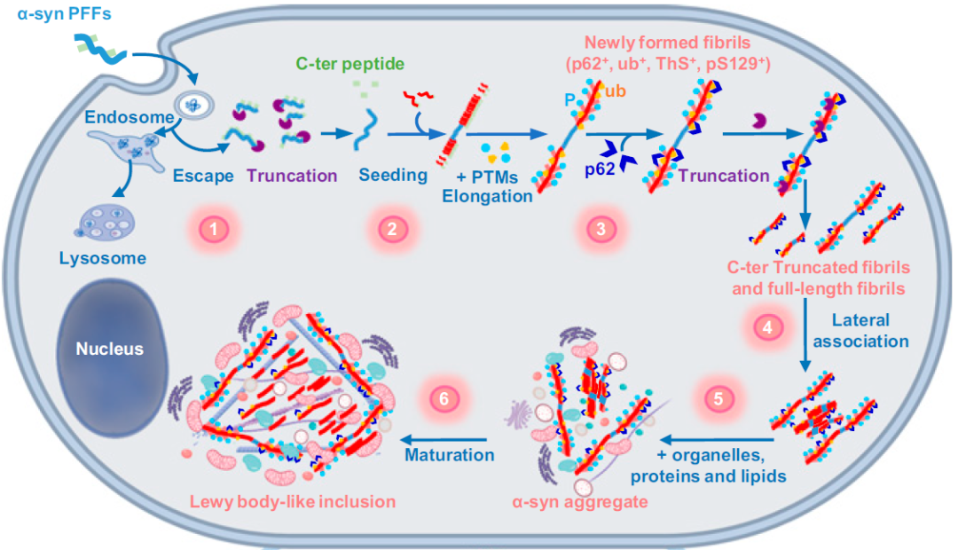 α-突觸核蛋白(α-Syn)由SNCA基因編碼,主要在突觸前和核周表達,并可能與突觸可塑性或神經遞質釋放相關。生理條件下,α-Syn以可溶性單體或四聚體的構象形式存在;病理狀態下,α-Syn的構象轉變為β折疊形式,錯誤折疊的α-Syn會聚集形成寡聚體,并逐漸發展為纖維原和不溶性纖維,細胞內細胞器被相互隔離和干擾,最終形成路易小體(Lewy body),進而導致神經元病變。A53T是α-突觸核蛋白(SNCA)的突變體,該突變體的聚集效果明顯強于非突變型α-突觸核蛋白,在神經元內可以更高效的形成路易小體,進而導致帕金森病的發生,借助AAV遞送SNCA (A53T)可以高效穩定的誘導帕金森疾病的產生和發展。