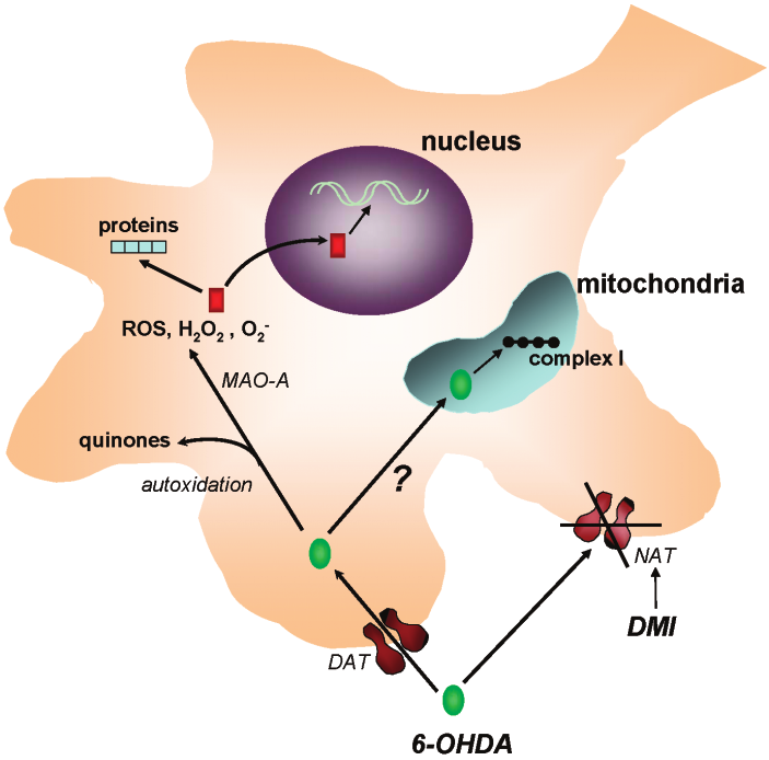圖2. 6-OHDA誘導神經毒性的機制示意圖(Simola N et al., Neurotox Res. 2007)