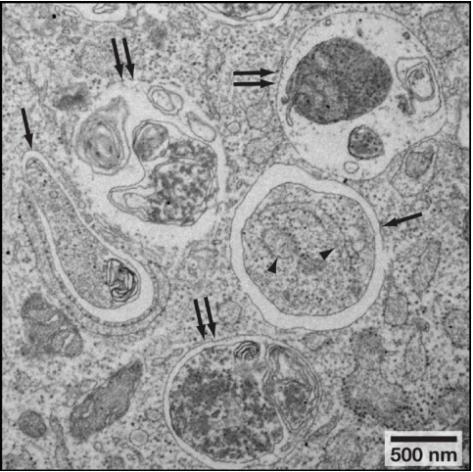 圖4. 透射電鏡下細胞自噬小體(單箭頭)和細胞自噬溶酶體(雙箭頭)形態