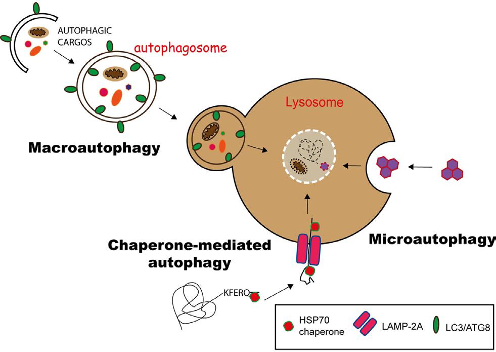③ 分子伴侶介導的細胞自噬(chaperone-mediated autophagy, CMA):具有KEFRQ樣基序的蛋白在HSP70伴侶的幫助下,通過LAMP-2A轉運體轉運到溶酶體。
