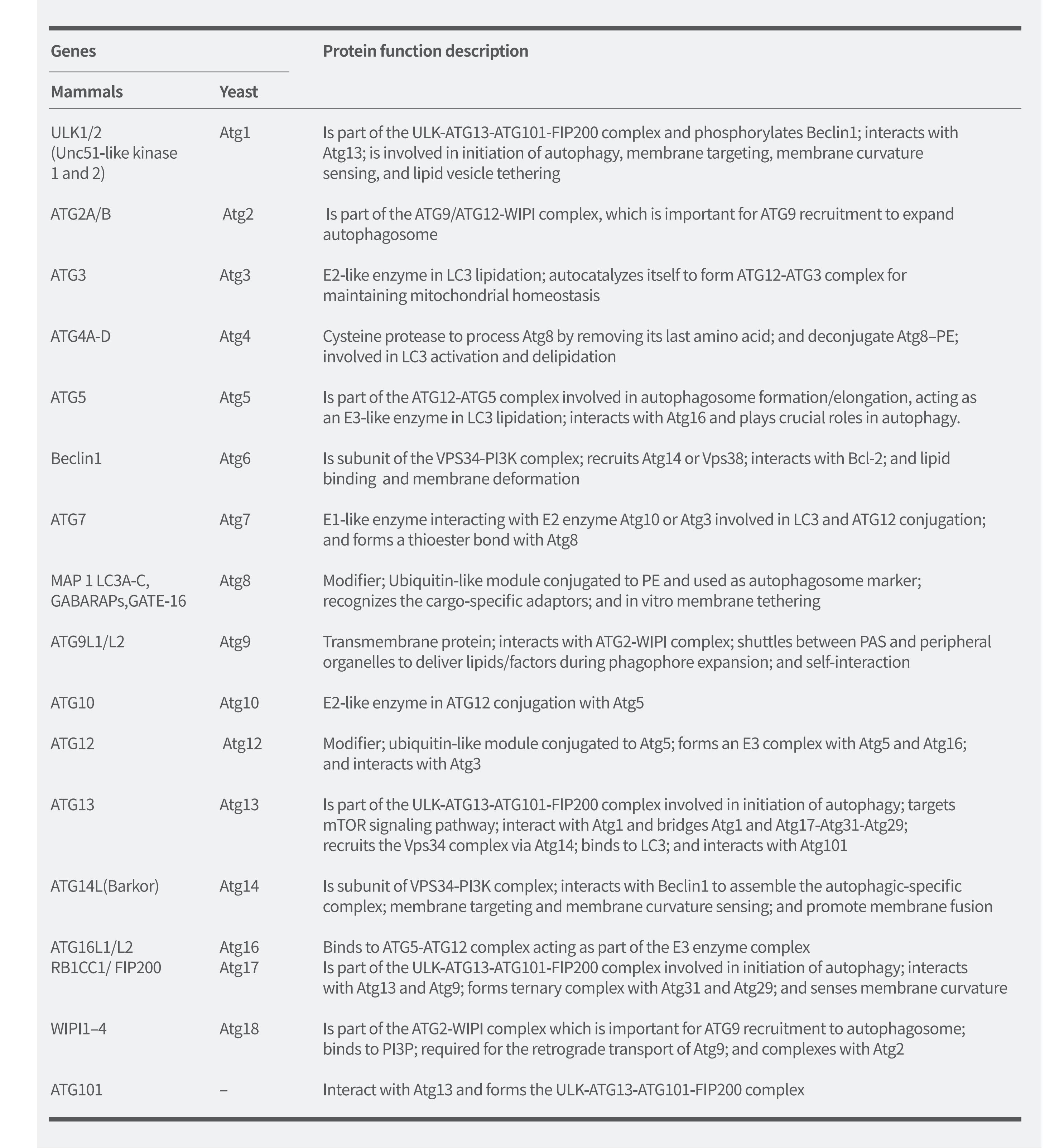 表1. 細胞自噬相關基因及其在細胞自噬中的蛋白質功能