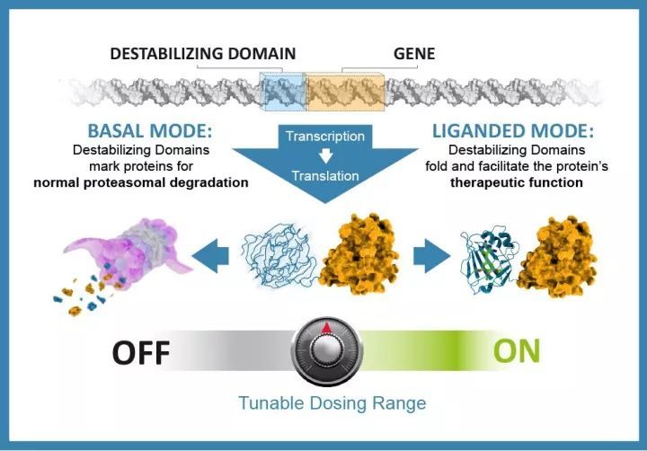 “不(bu)穩(wen)定(ding)結(jie)(jie)構域”(destabilizing domains,DD),是(shi)(shi)FK506-雷帕霉素結(jie)(jie)合蛋(dan)白FKBP突變(bian)體L106P,大小(xiao)12kD。當它(ta)與其它(ta)蛋(dan)白融合后(hou),會由泛素-蛋(dan)白酶體系統介(jie)導被(bei)快速組(zu)成型降解(jie)。而當加入細胞滲透性(xing)、能(neng)特異(yi)結(jie)(jie)合DD的(de)小(xiao)分(fen)子配體Shield1時,融合蛋(dan)白不(bu)再被(bei)降解(jie),目的(de)蛋(dan)白恢復行使正常的(de)細胞功能(neng),并且呈(cheng)現可(ke)逆與劑量依賴性(xing)。因(yin)此,DD-Shield1系統能(neng)可(ke)逆控制(zhi)蛋(dan)白表達,也正是(shi)(shi)因(yin)為這一(yi)點,被(bei)認定(ding)是(shi)(shi)一(yi)項(xiang)有前途的(de)技術(shu)正得到廣(guang)泛關注(zhu)。