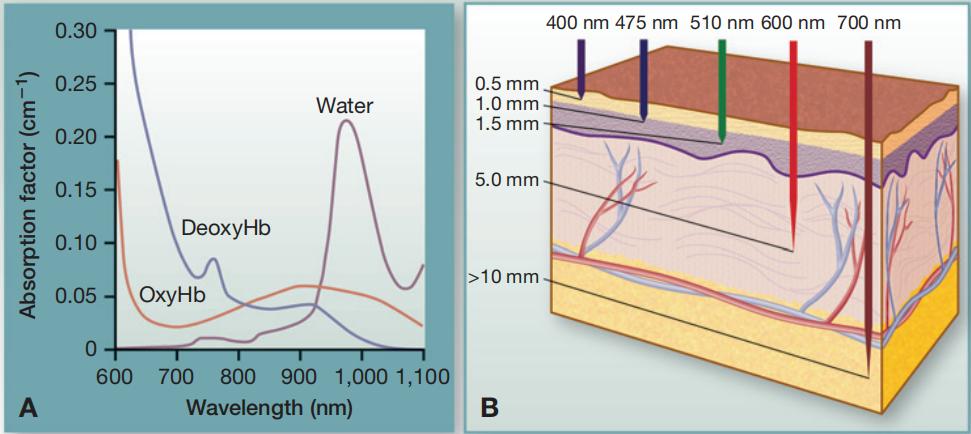 自(zi)(zi)GFP被首(shou)次用于標記基因后,水母來(lai)源的(de)GFP不斷被改造,得(de)到(dao)了(le)大量(liang)藍色(se)(se)、青色(se)(se)和(he)黃色(se)(se)的(de)衍生物。同(tong)時(shi),來(lai)自(zi)(zi)其他物種(zhong)的(de)FPs也被陸續(xu)鑒定,進一步將FPs的(de)顏色(se)(se)拓展至橙色(se)(se)、紅色(se)(se)和(he)紅外光譜區。從FPs被改(gai)造的(de)整個過(guo)程,我們可以看出(chu),FPs的(de)改(gai)造趨向紅移。因為FPs越紅越好,顏色越紅意味著波(bo)長(chang)越長(chang),對應的(de)激(ji)發光(guang)(guang)波(bo)長(chang)也更長(chang),長(chang)波(bo)長(chang)光(guang)(guang)的(de)激(ji)發對細胞和(he)組(zu)(zu)織(zhi)的(de)光(guang)(guang)損傷小(xiao),且(qie)背景(jing)自發熒光(guang)(guang)和(he)動(dong)物組(zu)(zu)織(zhi)的(de)光(guang)(guang)吸收都(dou)非常小(xiao),組(zu)(zu)織(zhi)穿透(tou)力強(qiang)(圖(tu)4)。這些特征使得紅色FPs更適合于體內深組(zu)(zu)織(zhi)成像。