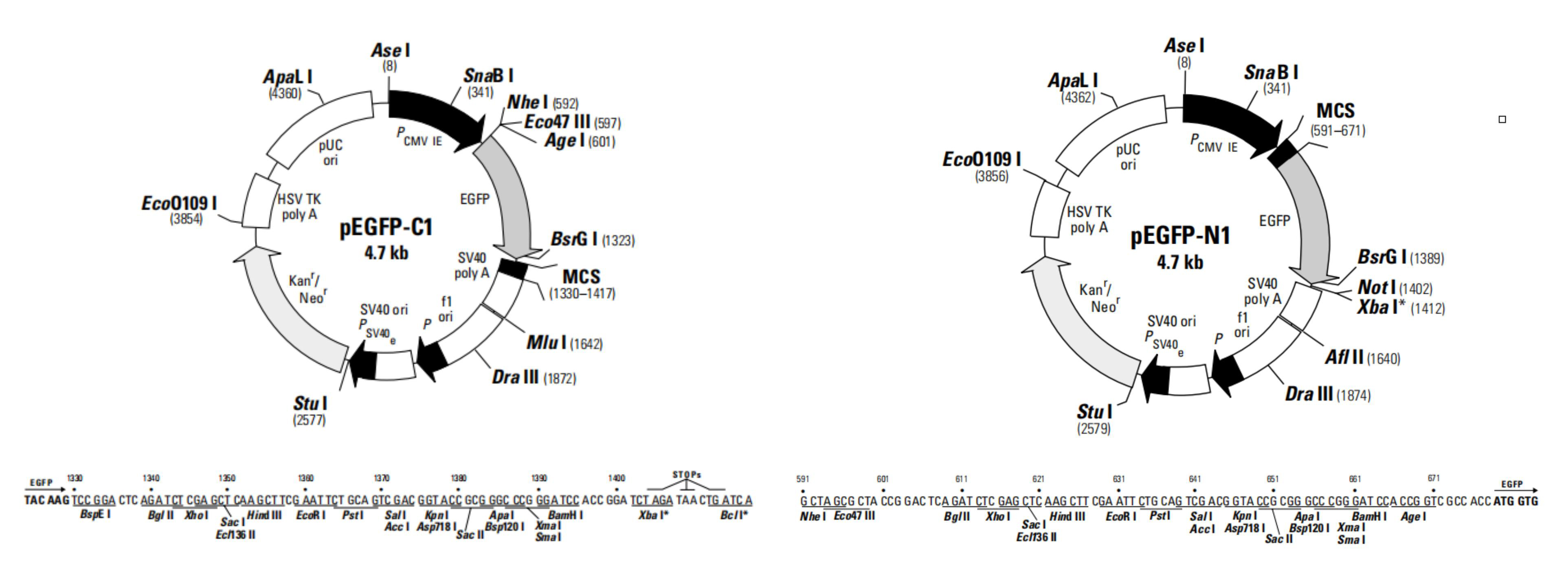作為(wei)標(biao)(biao)記蛋白(bai),構建熒光融(rong)合蛋白(bai)(Fluorescent Fusion Protein, FFP)可(ke)(ke)以(yi)用于(yu)研究蛋白(bai)定位(wei),追蹤其動態變化(hua),追溯其歷史和(he)研究蛋白(bai)之間的(de)相互作用。那么,如何構建FFP呢?在(zai)設計(ji)FFP時(shi),我(wo)(wo)們需(xu)要考(kao)慮多(duo)(duo)方面的(de)因素,如FFP的(de)預期用途,選(xuan)擇哪種FP,插入位(wei)置等(deng)(deng)等(deng)(deng)。隨著(zhu)FPs的(de)發現和(he)發展,很多(duo)(duo)熒光蛋白(bai)載(zai)體(ti)可(ke)(ke)通(tong)過商業化(hua)公(gong)司獲得。縱觀這些載(zai)體(ti),FP通(tong)常(chang)位(wei)于(yu)多(duo)(duo)克(ke)隆(long)位(wei)點附近(即目標(biao)(biao)蛋白(bai)的(de)N端或(huo)C端,圖6)。在(zai)根(gen)據上述FP選(xuan)擇指南選(xuan)定載(zai)體(ti)后,我(wo)(wo)們僅(jin)需(xu)通(tong)過簡單的(de)亞(ya)克(ke)隆(long)技術(shu)將目標(biao)(biao)蛋白(bai)克(ke)隆(long)至多(duo)(duo)克(ke)隆(long)位(wei)點區即可(ke)(ke)。當FP位(wei)于(yu)目標(biao)(biao)蛋白(bai)C端時(shi),為(wei)了確保兩者的(de)正確折疊和(he)功能,一段由2-10個(ge)氨基酸組成的(de)鏈接序列(GS間隔(ge),linker)往往是(shi)有(you)用的(de)。