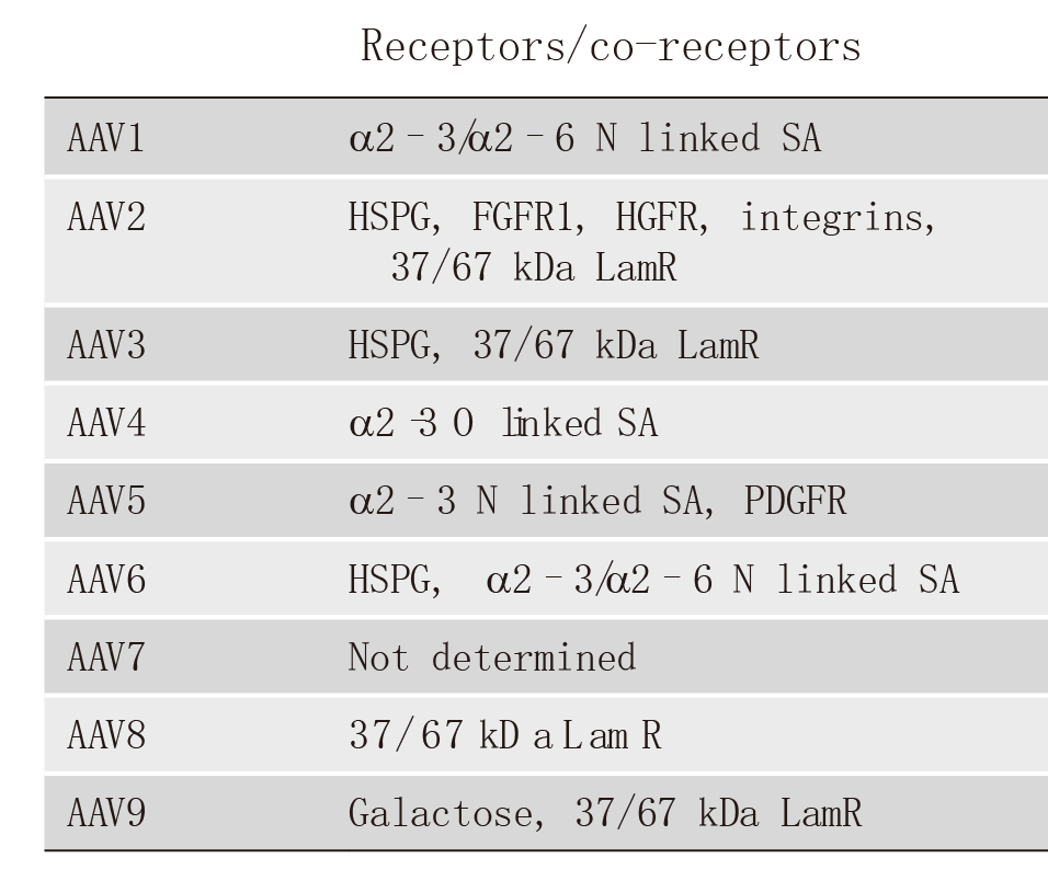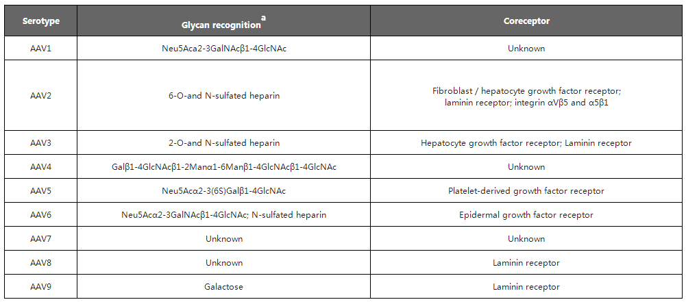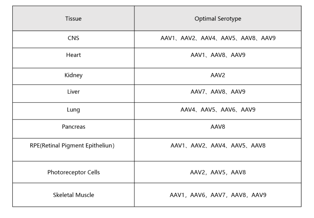 現階(jie)段研究人(ren)員已發現12種(zhong)人(ren)類(lei)AAV 血(xue)清(qing)(qing)(qing)型(xing)(AAV1至(zhi)(zhi)AAV12)和(he) 100多種(zhong)非人(ren)類(lei)靈長動物(wu)AAV血(xue)清(qing)(qing)(qing)型(xing)。下面(mian)列舉了人(ren)類(lei)AAV1至(zhi)(zhi)AAV9識別的(de)細胞表面(mian)受體及不同組織親嗜(shi)性,可(ke)根據(ju)組織類(lei)型(xing)選(xuan)擇(ze)(ze)合適的(de)AAV血(xue)清(qing)(qing)(qing)型(xing)。在選(xuan)擇(ze)(ze)血(xue)清(qing)(qing)(qing)型(xing)時,盡量選(xuan)擇(ze)(ze)對靶組織和(he)細胞有更高特異性和(he)轉導(dao)效率的(de)AAV。