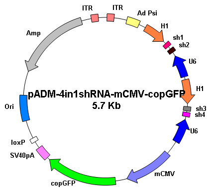 ② 250μl DMEM和1μg穿梭質粒、2μg包裝質粒(即腺病毒骨架質粒),配成Mix2。