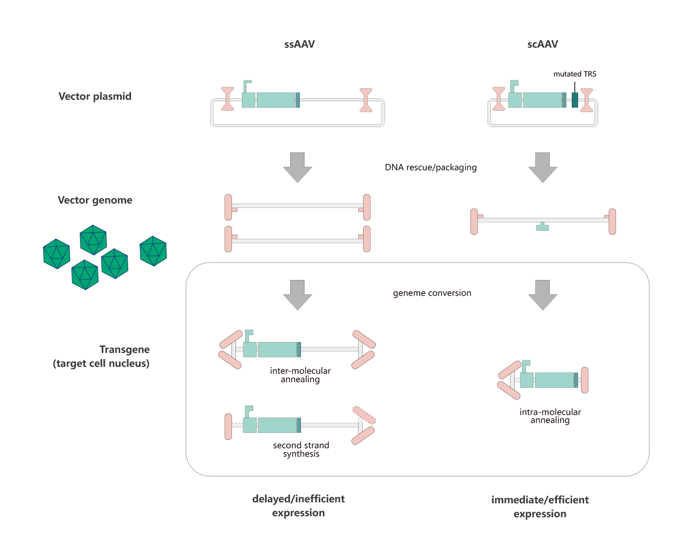 目前,研究人員常用的兩類AAV分別為single-stranded AAV (ssAAV) and self-complementary AAV (scAAV)。scAAV是基于2個基礎被開發的:一個是理論基礎:無論scAAV還是rAAV,病毒顆粒中均可包裹二倍體,甚至四倍體的AAV基因組DNA,一個是結構基礎:wtAAV ITR序列的特殊性(T型結構,見AAV基因組部分)。ssAAV包裝基因組正義鏈和反義鏈的幾率一樣。ssAAV在入核、脫衣殼后,需要借助宿主DNA聚合酶或者分子間退火完成雙鏈轉化,才能啟動基因轉錄過程,而scAAV中已存在雙鏈,它入核后即可啟動基因轉錄,跨過了雙鏈轉化的步驟,從而實現外源基因的快速表達。下圖是ssAAV和scAAV向靶細胞中遞送外源基因的過程。