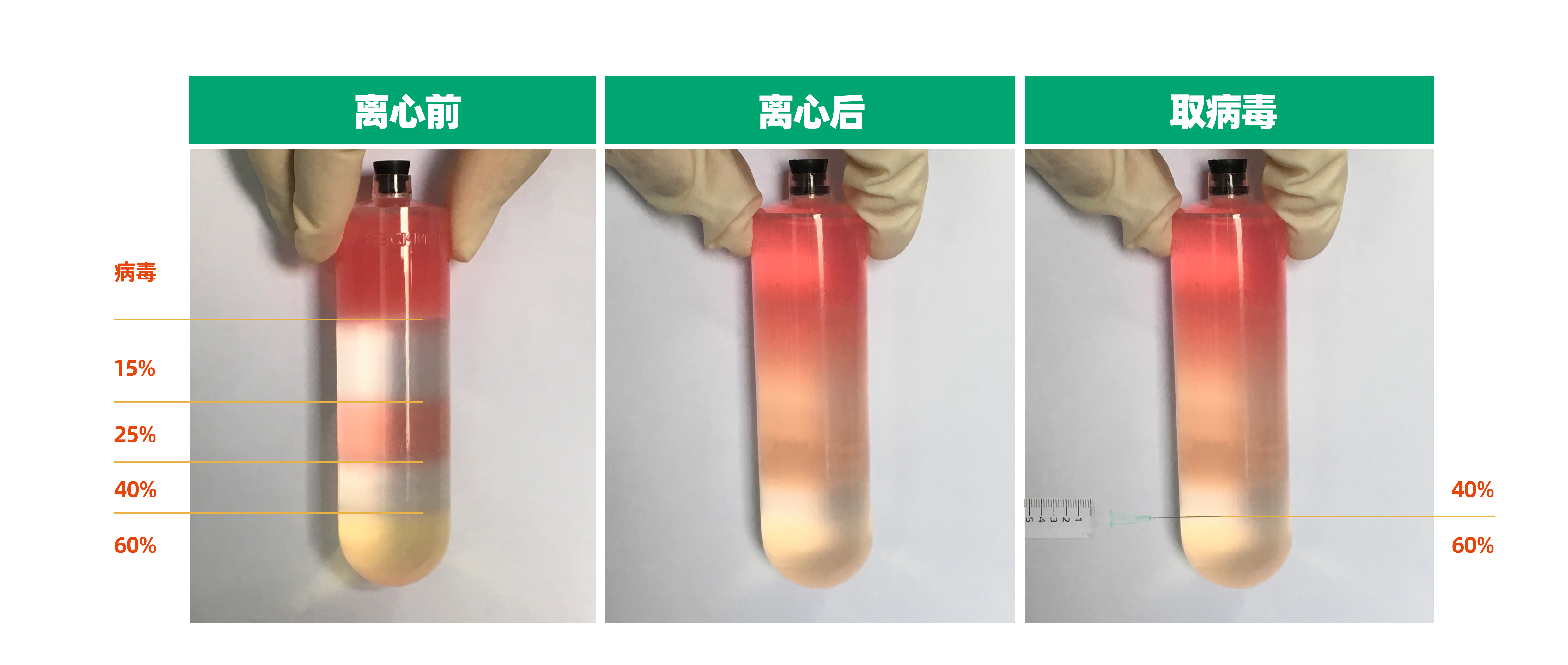 維真生物采用碘克沙醇密度梯度超速離心法對AAV病毒進行純化。碘克沙醇是一種造影劑,已接受了臨床檢驗。它具有非離子型、對細胞無毒和代謝惰性等優點。現在在病毒純化方面應用廣泛。它利用不同顆粒之間存在的沉降系數差,在一定離心力作用下,顆粒各自以一定速度沉降,在密度梯度不同區域上形成區帶。下圖是AAV病毒純化前后的示意圖: