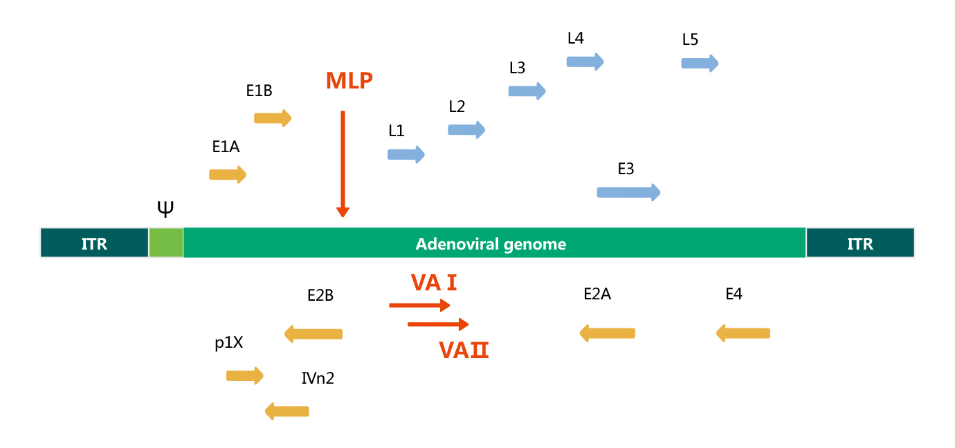 腺病毒是一種雙鏈線性的DNA病毒,其基因組長度約為36kb。基因組兩端各有一個103 bp的反向末端重復序列(inverted terminal repeat, ITR),參與病毒DNA的復制;ITR的內側為病毒包裝信號Ψ,參與腺病毒基因組的衣殼化。基因組包含早期表達的與腺病毒復制相關的E1~E4基因和晚期表達的與腺病毒顆粒組裝相關的L1~L5基因。下圖是人類血清5型腺病毒基因組的示意圖: