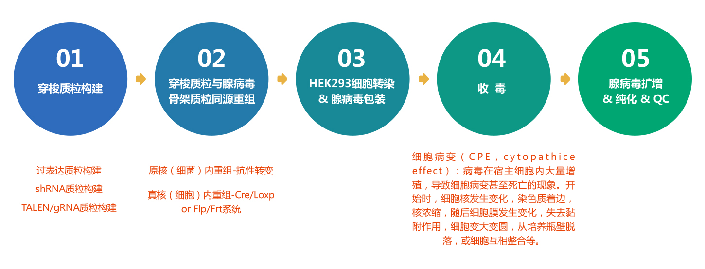 維真生物可以提供從腺病毒(AdV)質粒設計、構建、包裝到表達分析的所有服務外包項目。而且,維真生物全套的腺病毒載體和表達系統可用于體內和體外表達human/mouse/rat ORFs,lncRNA,circRNA,shRNAs和CRISPR/gRNA。維真生物生產的腺病毒具有滴度高、純度高和穩定性高的三高優點。下面是腺病毒從頭合成的流程: