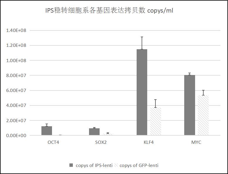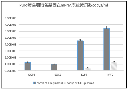 隨后,我們對實驗組與對照組細胞中四種轉錄因子mRNA水平的表達情況進行了定量檢測,如下圖所示,我們發現實驗組細胞中四種轉錄因子的mRNA表達量都要明顯高于GFP對照組,這一結果同樣佐證了上述結論,有大量的雙慢病毒載體進入了同一細胞中,四種轉錄因子實現了高表達。