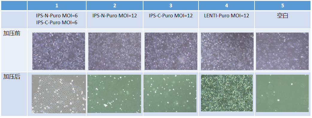 接著,我們將上述兩個慢病毒載體分別包裝成慢病毒,進行293A細胞的共感染,如下圖所示設置實驗組和對照組,感染72小時后,加Puro進行篩選,我們發現,空白組細胞(5)和單一慢病毒感染組(2、3)的細胞,出現大量死亡,而“攝取”到雙病毒的實驗組(1)和GFP組(4),細胞存活率明顯高于兩病毒單獨感染組,在篩選一周后我們成功獲得了大量穩轉株細胞。