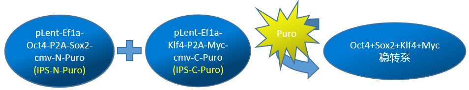然而,目前研究人員用來產生誘導性多能干細胞的方法耗時長且效率低,當把四種轉錄因子導入成體細胞如皮膚細胞中時,利用上千個皮膚細胞最終只能獲得幾個iPSCs。因此,我們嘗試利用新建立的分裂篩選標記的慢病毒穩轉系統同時表達以上四種轉錄因子,在短時間內獲得穩轉細胞系。