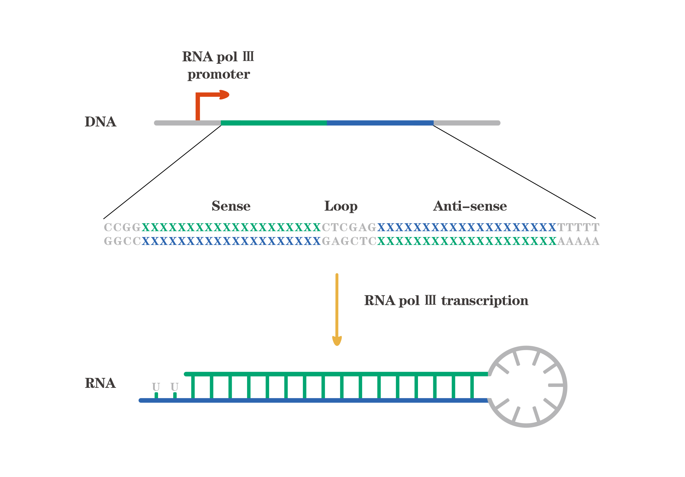 shRNA的RNAi機制與microRNA成熟機制一樣,因此,shRNA也可以由聚合酶II型啟動子驅動表達。這類啟動子包括廣譜啟動子(如CMV、CAG和EF1a等)和組織特異性啟動子(如hSyn、TBG和cTnT等),可以啟動較大的基因轉錄,且需要polyA等轉錄終止信號。維真生物可以根據客戶指定的啟動子和提供的shRNA序列將其構建至mir30-based shRNA質粒。mir30-based shRNA結構示意圖如下: