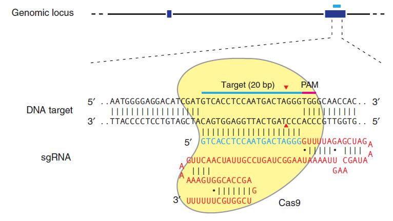 CRISPR/Cas9系統需要兩個關鍵基因序列:gRNA和Cas9,gRNA的功能是識別目的DNA序列,并引導Cas9蛋白到目的基因序列處進行切割。gRNA序列由兩部分組成:能夠與目的基因匹配的序列和能夠與Cas9蛋白結合的序列。Cas9是一種能切割DNA雙鏈的核酸內切酶,在匹配的基因的PAM序列的上游3-4堿基處進行DNA雙鏈的切割。