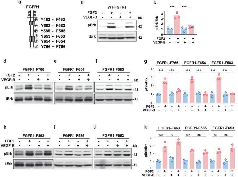 為研究VEGF-B誘導的(de)(de)下游信(xin)號,作(zuo)(zuo)(zuo)者使(shi)用(yong)(yong)不同類型(xing)的(de)(de)內皮(pi)細(xi)(xi)胞篩選了磷酸(suan)(suan)化(hua)激(ji)酶抗體(ti)陣(zhen)列,發(fa)現(xian)VEGF-B降(jiang)低了人皮(pi)膚微血管(guan)內皮(pi)細(xi)(xi)胞1(HMEC1)、HRECs和(he)(he)HUVECs中的(de)(de)Erk磷酸(suan)(suan)化(hua),驗證發(fa)現(xian)VEGF-B的(de)(de)抑(yi)(yi)制(zhi)作(zuo)(zuo)(zuo)用(yong)(yong)是(shi)特異(yi)性的(de)(de),VEGF-B對FGF2誘導的(de)(de)FGFR1激(ji)活的(de)(de)抑(yi)(yi)制(zhi)作(zuo)(zuo)(zuo)用(yong)(yong)在(zai)小鼠視(shi)網(wang)膜的(de)(de)體(ti)內也(ye)得到了證實。作(zuo)(zuo)(zuo)者進一步(bu)用(yong)(yong)苯丙氨(an)(an)酸(suan)(suan)(F)分(fen)別代替FGFR1的(de)(de)六(liu)個(ge)酪氨(an)(an)酸(suan)(suan)(Y),產生(sheng)了一系列的(de)(de)定點突(tu)(tu)變(bian)。VEGF-B在(zai)表達(da)野生(sheng)型(xing)FGFR1 (WT-FGFR1)和(he)(he)FGFR1-F766, FGFR1-F654和(he)(he)FGFR1-F583突(tu)(tu)變(bian)體(ti)的(de)(de)細(xi)(xi)胞中抑(yi)(yi)制(zhi)了FGF2誘導的(de)(de)Erk磷酸(suan)(suan)化(hua),但(dan)在(zai)表達(da)FGFR1-F463, FGFR1-F585和(he)(he)FGFR1-F653突(tu)(tu)變(bian)體(ti)的(de)(de)細(xi)(xi)胞中未發(fa)現(xian)該抑(yi)(yi)制(zhi)作(zuo)(zuo)(zuo)用(yong)(yong),表明(ming)酪氨(an)(an)酸(suan)(suan)殘(can)基Y463, Y585和(he)(he)Y653對VEGF-B的(de)(de)抑(yi)(yi)制(zhi)作(zuo)(zuo)(zuo)用(yong)(yong)很重要。利用(yong)(yong)腺病毒(維真助力)在(zai)HUVECs中過表達(da)野生(sheng)型(xing)FGFR1和(he)(he)Y463F, Y585F和(he)(he)Y653F突(tu)(tu)變(bian)體(ti),結果發(fa)現(xian)VEGF-B在(zai)過表達(da)FGFR1 WT的(de)(de)HUVECs中增(zeng)加(jia)了VEGFR1/FGFR1復合物的(de)(de)形成,但(dan)在(zai)過表達(da)FGFR1 Y463F、FGFR1 Y585F或FGFR1 Y653F突(tu)(tu)變(bian)體(ti)的(de)(de)HUVECs中沒有增(zeng)加(jia),表明(ming)酪氨(an)(an)酸(suan)(suan)殘(can)基Y463、Y585和(he)(he)Y653在(zai)介導VEGF-B誘導的(de)(de)VEGFR1/FGFR1復合物形成中的(de)(de)作(zuo)(zuo)(zuo)用(yong)(yong)。以上(shang)體(ti)內外數據均表明(ming)VEGF-B對FGF誘導的(de)(de)Erk活化(hua)具有抑(yi)(yi)制(zhi)作(zuo)(zuo)(zuo)用(yong)(yong)。