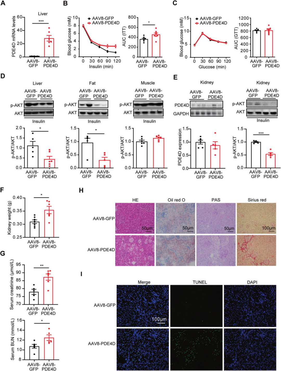 作者先前的研究表明PDE4D在肝臟中過表達可誘導肝脂肪變性。為了進一步研究肝臟PDE4D對腎臟結構和功能的影響,研究人員借助AAV8病毒載體實現了小鼠肝臟中PDE4D的過表達。分析發現AAV8-PDE4D處理的小鼠表現出胰島素耐受以及肝臟胰島素信號的受損;不僅如此,小鼠腎臟胰島素信號也受到損害。此外,肝臟中PDE4D的過表達導致腎臟發生損傷,并伴有腎臟重量增加、血清肌酐和BUN水平升高,以及膠原積累和細胞凋亡增加。這些結果表明肝臟PDE4D的過表達在NAFLD和腎損傷中起關鍵作用。