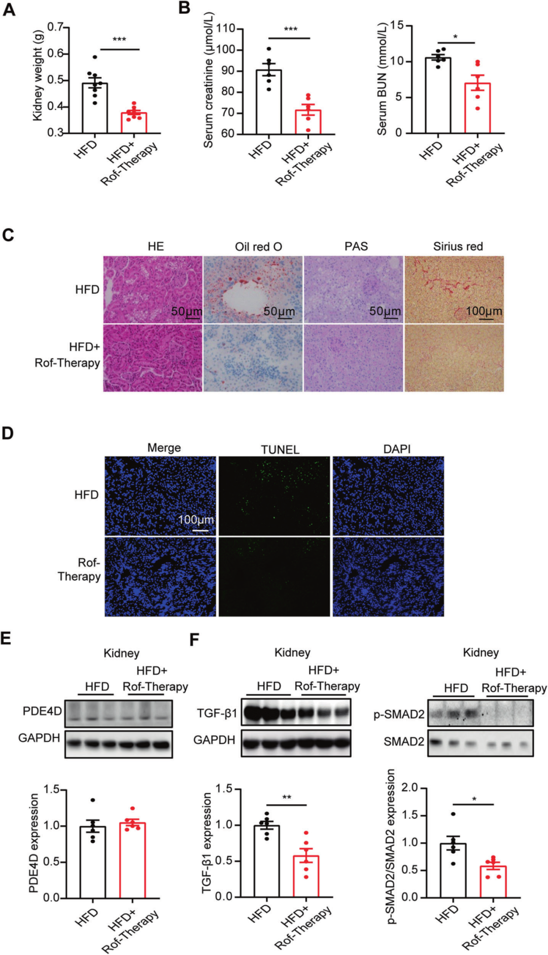 本研究證明HFD喂養特異性地誘導肝臟中PDE4D的表達,PDE4D高表達加重肝臟脂質沉積和胰島素抵抗,進而促進TGF-β1分泌入血,導致腎臟損害。肝臟PDE4D基因缺失或使用PDE4抑制劑羅氟司特治療可有效逆轉HFD誘導的腎功能障礙。這些研究結果為CKD提供了一種新的治療策略。
