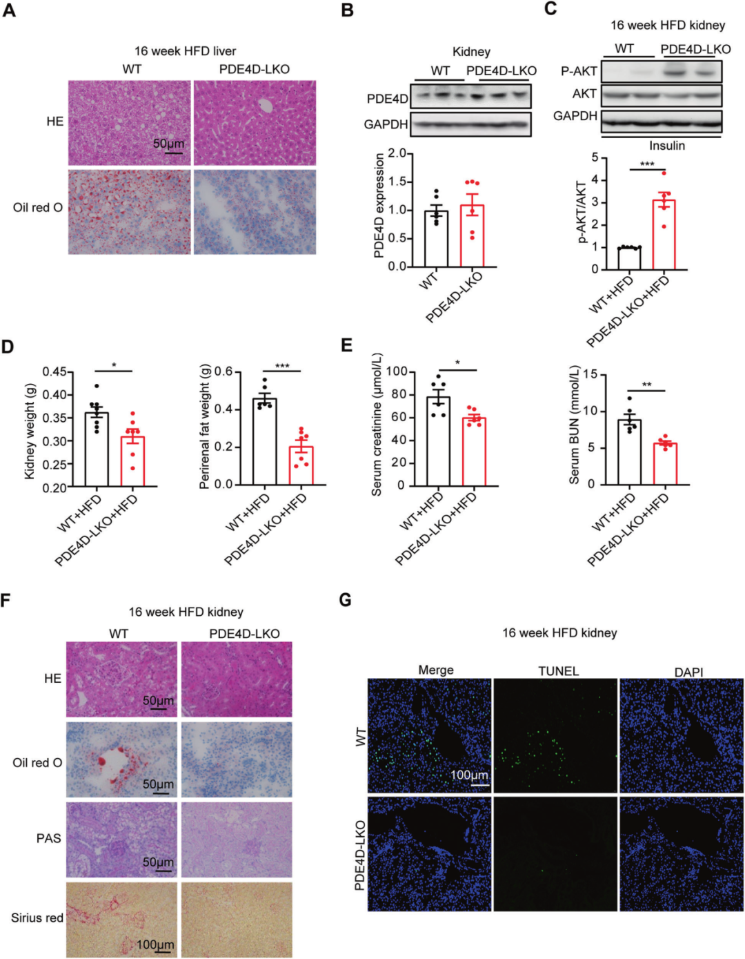 高脂肪飲食(HFD)是NAFLD和腎功能障礙的致病因素,作者發現HFD喂養后小鼠肝臟PDE4D表達顯著增加,而腎臟PDE4D表達不變。隨后構建了肝臟特異性PDE4D敲除(PDE4D-LKO)小鼠,高脂喂養后,PDE4D-LKO小鼠的異常代謝不僅得到明顯好轉,HFD誘導的肝臟腫脹和脂質沉積也大大減輕。進一步分析發現,PDE4D-LKO小鼠腎臟對胰島素敏感性增加,此外小鼠的腎臟重量和腎周脂肪重量顯著降低,腎功能也得到改善。這些發現表明肝臟PDE4D缺乏改善了HFD誘導的肝脂肪變性和相關的腎損害。
