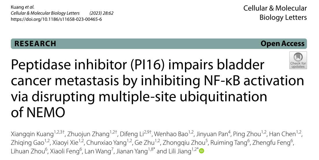 2023年7月31日,廣州醫科大學附屬腫瘤醫院蔣麗麗、楊建安研究團隊在Cellular & Molecular Biology Letters,IF 8.3上在線發表了題為“Peptidase inhibitor (PI16) impairs bladder cancer metastasis by inhibiting NF-κB activation via disrupting multiple-site ubiquitination of NEMO”的文章。研究表明,PI16通過抑制腫瘤生長和轉移在BLCA中發揮腫瘤抑制作用,PI16可能作為轉移性BLCA的潛在生物標志物。