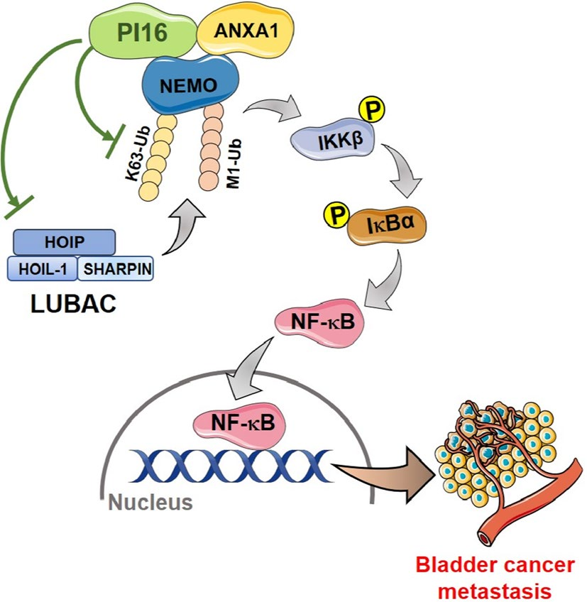 K63連接的泛素化招募線性泛素組裝復合物( LUBAC ),產生M1連接的泛素化。LUBAC結合NEMO,誘導IKK復合物改變并激活NF-κB信號激活。研究發現HOIP、HOIL-1和Sharpin隨著PI16過表達而降低,而隨著PI16敲低而升高,ANXA1的下調挽救了這種減少。LUBAC抑制劑HOIPIN-8以劑量依賴的方式降低PI16敲除引起的NF-κB活化,HOIPIN-8還能抑制PI16敲低引起的運動和侵襲,表明LUBAC介導了PI16抑制的NF-κB和運動和侵襲。綜上所述,PI16作為BLCA的抑制因子,通過ANXA1依賴性抑制NEMO K63和M1泛素化,抑制NF-κB,最終抑制侵襲和轉移。