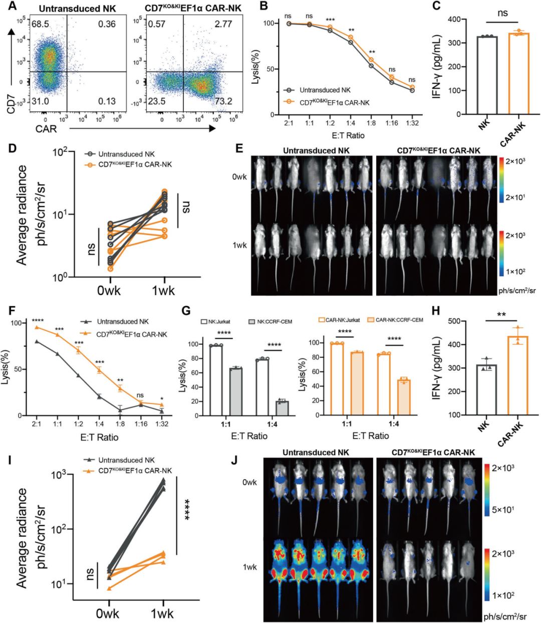 由于健康T細胞和惡性T細胞較難區分,在分離自體T細胞制造針對T細胞惡性腫瘤的CAR-T細胞時,易導致產品污染。NK細胞可以有效地從T細胞中分離出來,因此使用NK細胞能在很大程度上避免這一問題。但NK細胞也表達CD7,會導致CAR-NK細胞的自相殘殺。因此作者試圖使用2合1 CD7KO&KI策略來設計CD7特異性的CAR-NK細胞。CD7KO&KIEF1α CAR-NK細胞對Jurkat細胞表現出高效的細胞毒性以及強勁的細胞因子分泌。體內實驗表明,CAR-NK具有有效的抗Jurkat腫瘤活性,并對難控制的CCRF-CEM腫瘤表現出強大的效應功能。上述結果表明將EF1α驅動的CD7 CAR插入CD7位點是一種可行的策略,在T細胞和NK細胞中均有效。